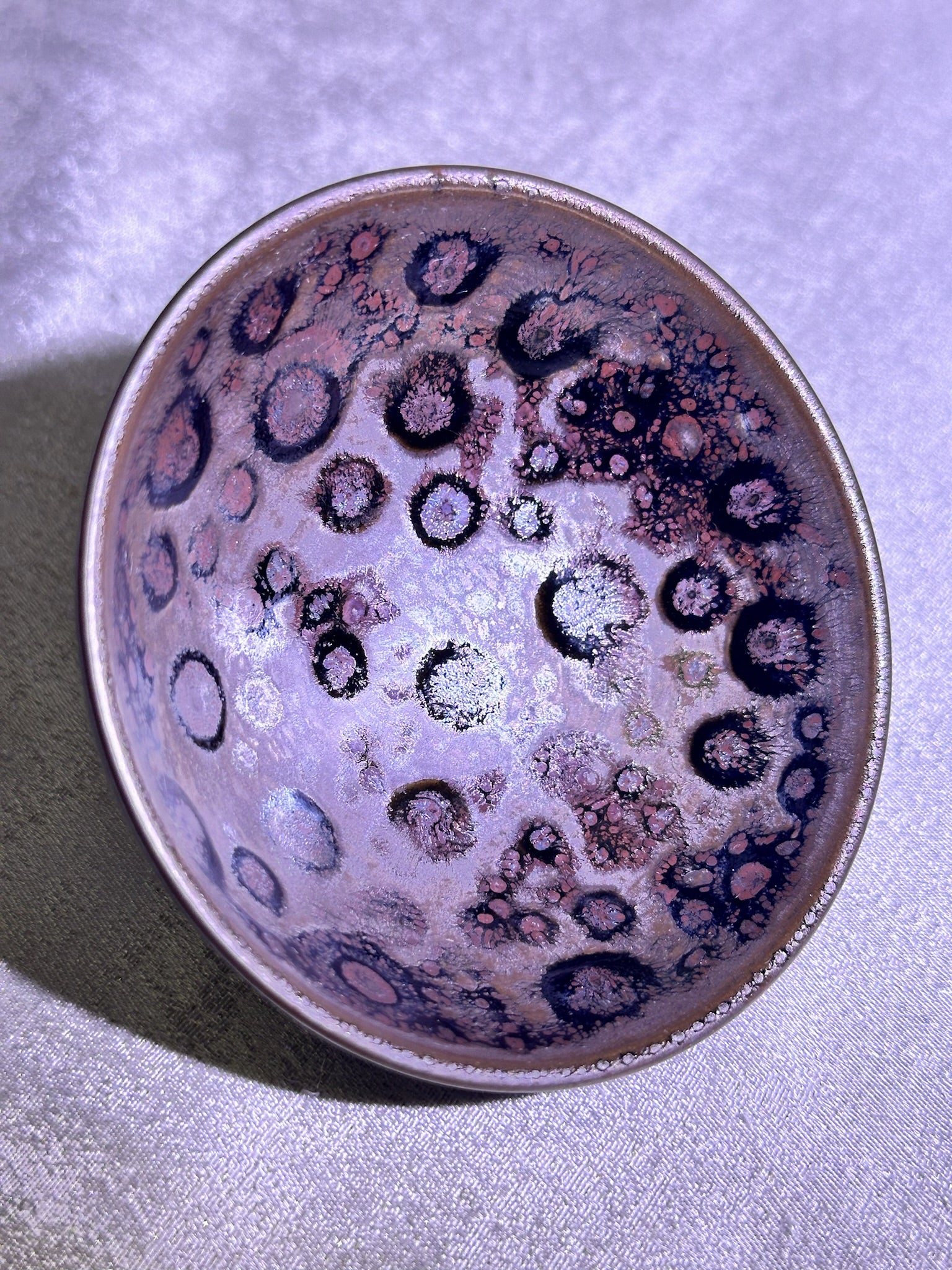 Cup10-Ox-blood red glaze with strong crystalized heaven eyes spots pattern flat mouth shape cut